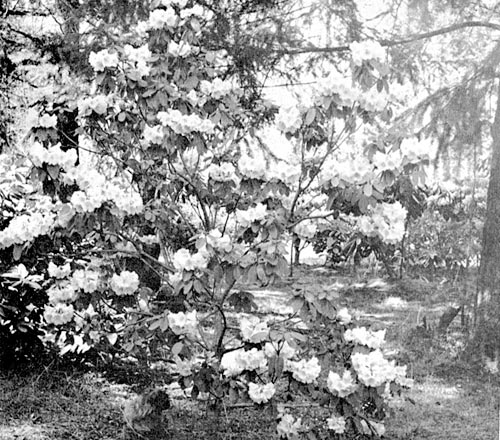 Another good early flowering sort which has not received its due is R. planetum , of the Fortunei series. It is one of those rugged, adaptable sorts which seem to do well in any garden situation, and I know of no species of its season which appears to such advantage in so great a variety of planting sites. The loose clusters of white or clear pink blossoms are borne in the greatest profusion on shrubs 8 or 10 feet tall. Every gardener who owns it praises its amiability and the reliable floral display. It is surely among the very best of the rhododendrons which flower in the first part of April.