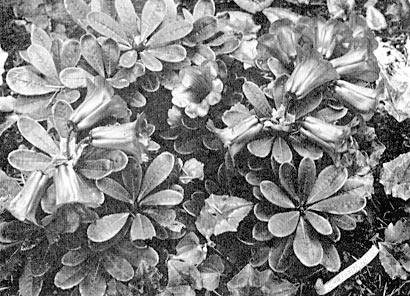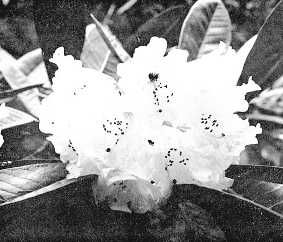 At the great Rhododendron Show in London on May 3rd, Windsor Great Park staged an educational exhibit of the many forms of R. fictolacteum. An entire table was occupied with specimen trusses from the numerous plants in their collection. Actually, however, many of the flowers shown were R. rex, the number of one species or the other represented in, the display being purely a matter of personal opinion. The fact is that R. fictolacteum (Fig. 45) and R. rex merge in a progression of intermediate forms, and there is a substantial range between the two where the preference of the observer in emphasizing any one of several botanical characteristics determines to which species a particular plant is assigned.
